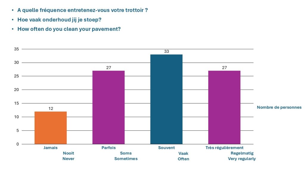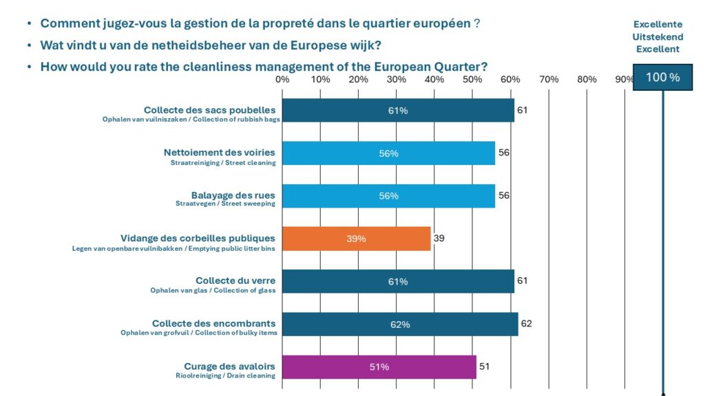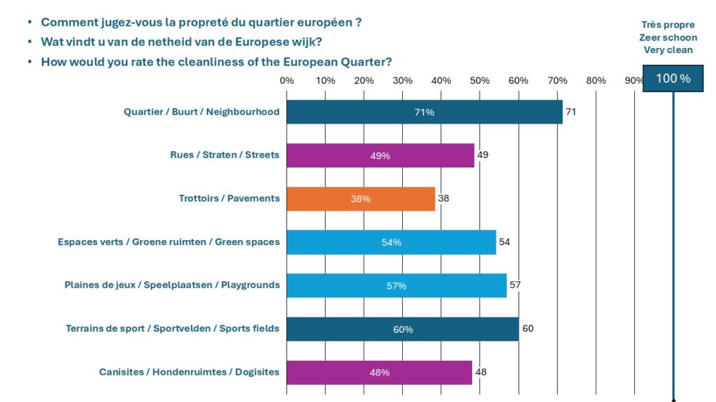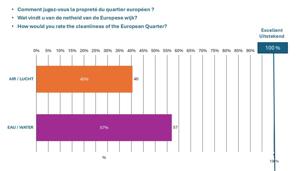 Au printemps 2025, le GAQ a réalisé un sondage trilingue sur la propreté et l’environnement auprès des habitants et des usagers du quartier européen. Les questions portaient sur la propreté, la gestion publique, le tri domestique, l’entretien des trottoirs, la qualité de l’air et de l’eau. Lors de la clôture du sondage le 5 juin 2025, 100 personnes y avaient répondu.