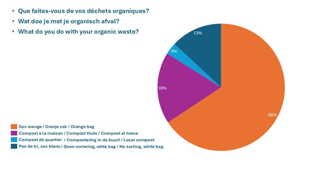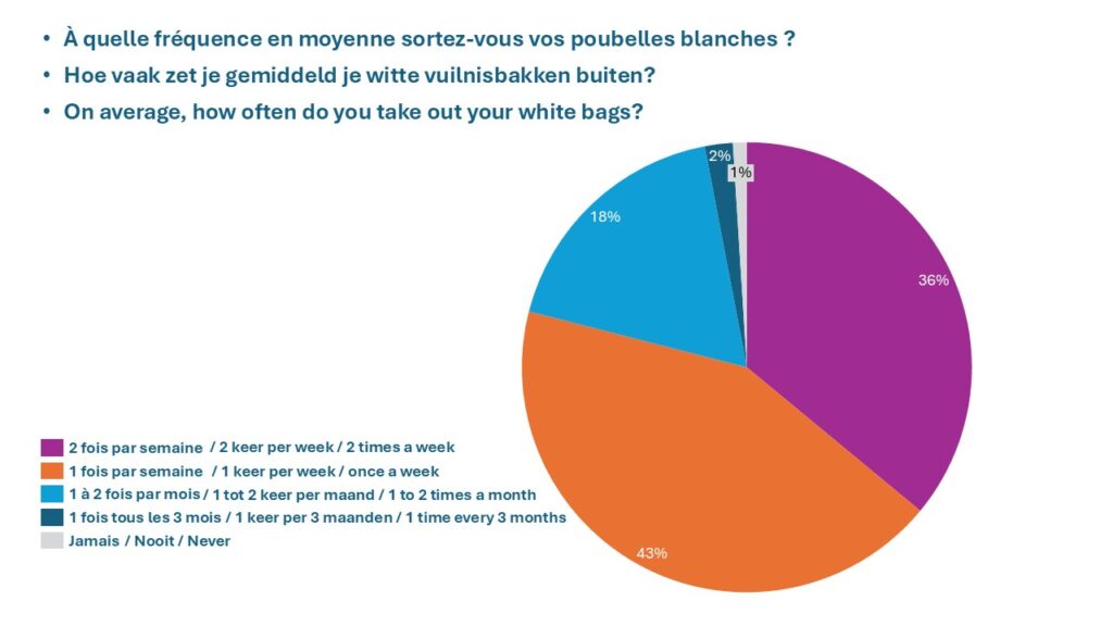 Comptant 18.864 habitants (IBSA[3]), notre quartier produit un volume énorme de sacs poubelles, d’autant que la majorité des gens sortent au moins un sac blanc par semaine (79% des répondants). Certains estiment que c’est « aux habitants de consommer raisonnablement et de produire moins de déchets », notamment avec « moins de livraisons à domicile ». Plus structurellement, il faudrait « interdire ou consigner le jetable » ou encore « soutenir des entreprises locales pour le recyclage de par exemple : pain, vêtements, livres, papier ».